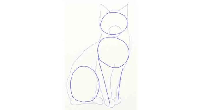 Po narysowaniu podstawowych kształtów, czas na łączenie ich w jedną całość. Zaczynając od głowy, narysuj dwie krzywe linie w dół, które staną się ciałem kota. Pamiętaj, aby jedna z linii była bardziej wygięta, aby oddać kształt grzbietu. Dodaj cylindryczne kształty dla przednich łap oraz „C” dla tylnej łapy. Po połączeniu tych elementów, uzyskasz sylwetkę kota, która będzie gotowa na dalsze detale.